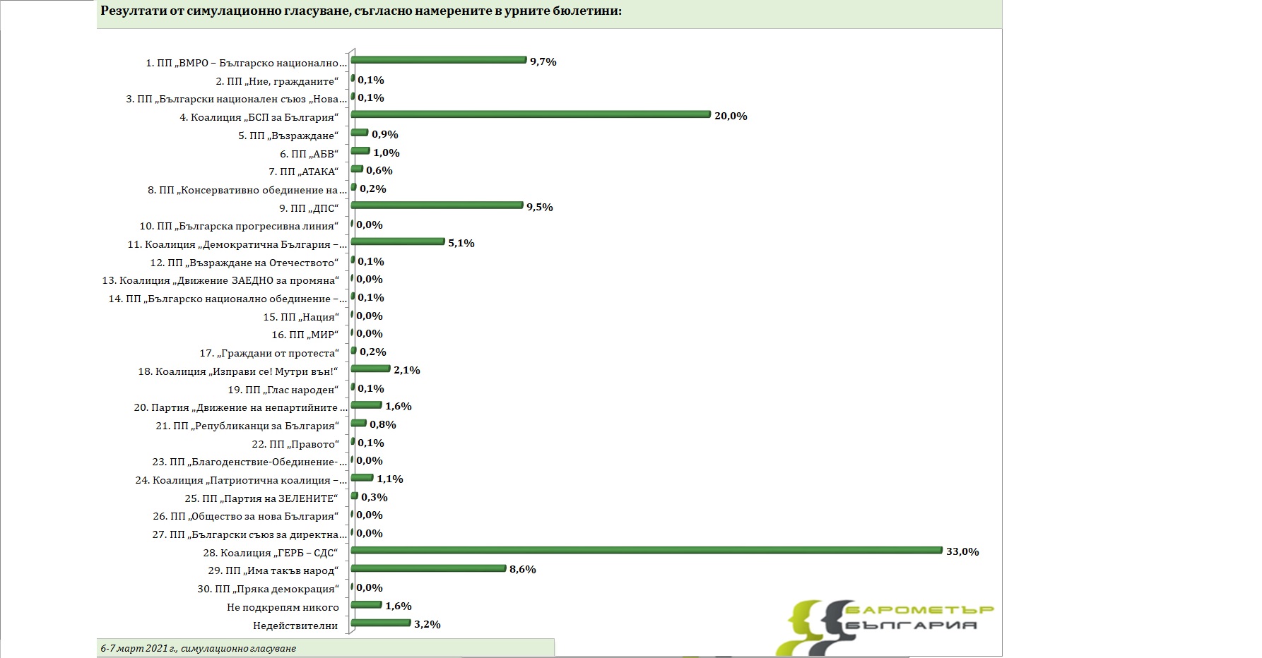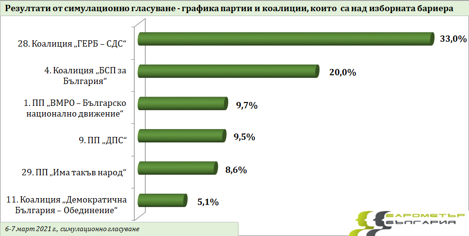 Резултатите от проведената симулация показаха, че ГЕРБ все по-категорично мобилизира своя електорат и печели гласовете на 33% от участниците. БСП остава на второ място, но изостава все повече с 20% подкрепа. Продължаващите процеси на разделение и разпад в столетницата водят до отлива на избиратели към тях. Забелязва се и преминаването на знакови фигури, свързани с БСП към избирателните списъци на други формации, което също води до преразпределение на избиратели. ДПС могат да разчитат на безусловната подкрепа на традиционния си електорат – 9,5%.