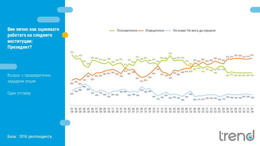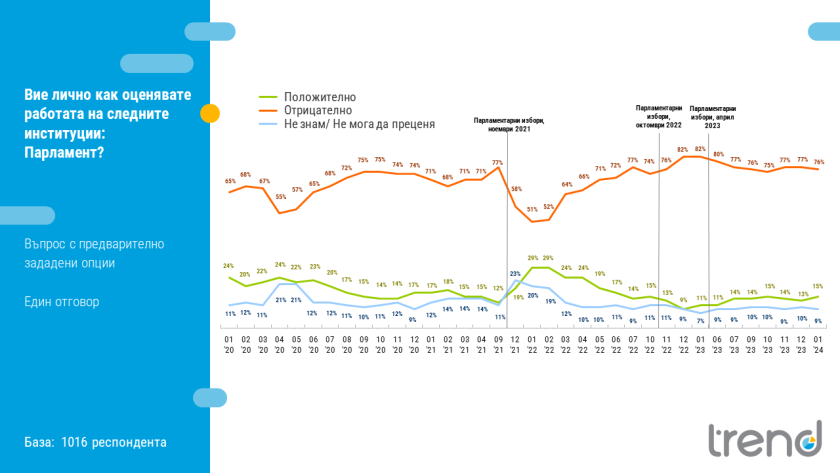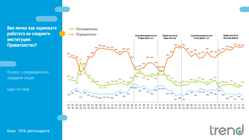 Няма промяна в електоралната картина в страната. Няма очакване, че ротацията ще доведе до съществена промяна в управлението. Запазват се ниските нива на положително отношение спрямо работата на основните институции – това са част от изводите от проучване на изследователски център "Тренд" по поръчка на вестник "24 часа", посветено на нагласите на българите спрямо основните институции, партиите и актуални теми.