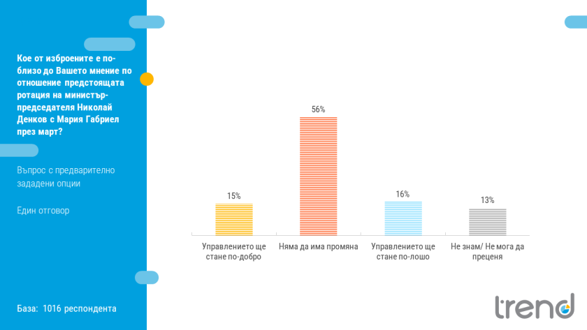 Предстоящата ротация на министър-председателя Николай Денков с Мария Габриел не води до сериозно очакване за промяна в управлението. Според 56% ротацията няма да промени съществено управлението. Почти идентични са дяловете на хората, които смятат, че управлението ще се стане по-добро (15%) или обратното – по-лошо (16%).