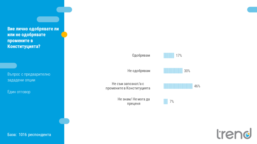 Близо половината от българите (46%) признават, че не са запознати по същество с промените в Конституцията. Само 17% изразяват одобрение към тях, като това се отнася за приблизително половината от избирателите на ГЕРБ и ПП-ДБ, както и около една пета от тези на ДПС. 30% не одобряват промените.