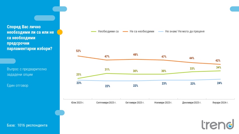 Наблюдава се лек ръст в желанието за предсрочни парламентарни избори от 30% през ноември до 34% през януари. 42% са на мнение, че предсрочен вот не е необходим.
