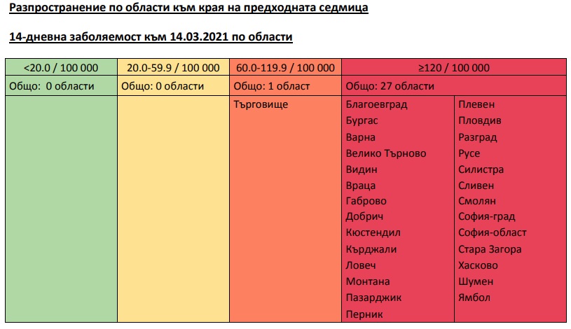 Единствената единствената област, която все още е в по-ниската "жълта" зона е търговище със 79 болни на 100 000.