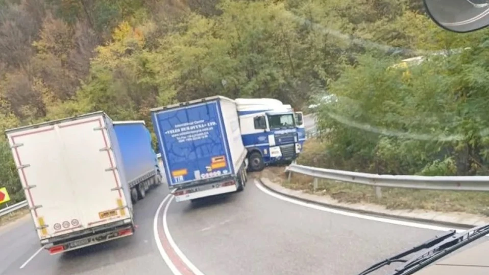 Тир е аварирал на остър завой, като е застанал напречно на платното и затруднява преминаването на останалите превозни средства. Чака техника за изтеглянето му.
