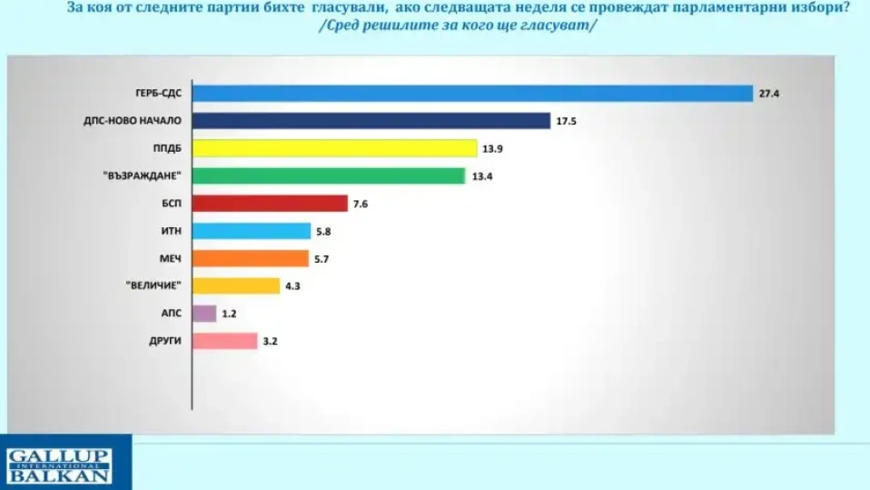 Сред решилите за кого ще гласуват ГЕРБ-СДС запазва убедителна водеща позиция с 27,4% подкрепа (при 25,7% през юли) – най-висок резултат от началото на годината. Значение за укрепването на електоралната подкрепа на формацията има дейността на правителството, последователната работа по ключови теми като присъединяването към еврозоната, изпълнението на Плана за възстановяване и устойчивост, поддържането на икономическа стабилност.
