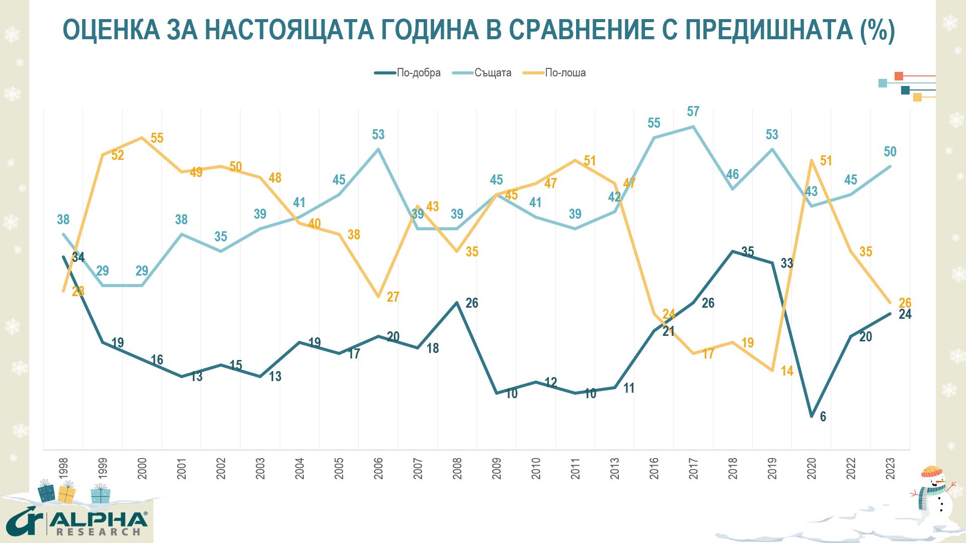 Оценките за изминалата 2023-та са по-добри от тези преди една година. Основно, защото за пълнолетните българи тя е била по-успешна за тях и семействата им, отколкото за страната и света.