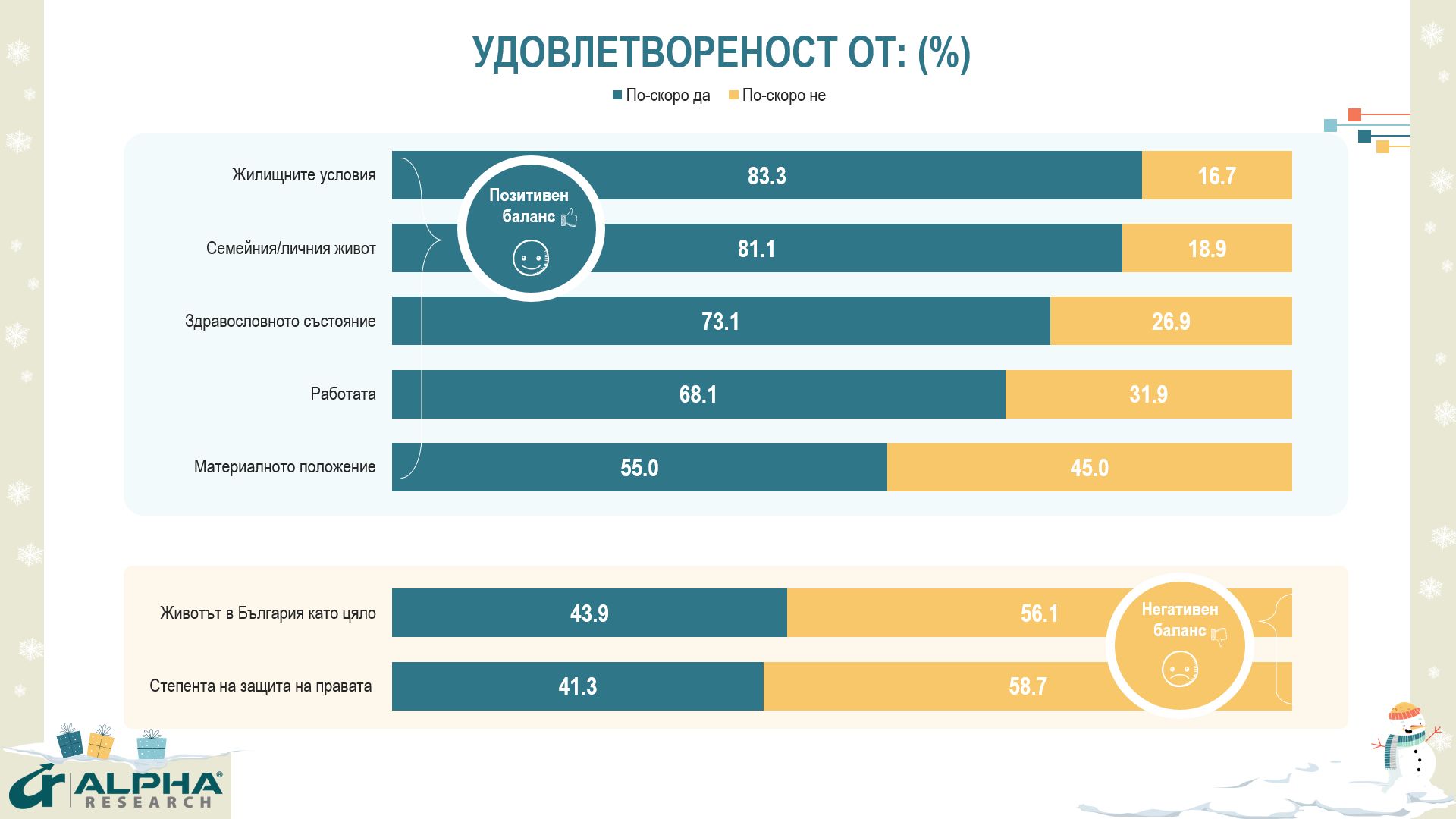По-високата удовлетвореност в личен план спрямо макро картината намира израз и през конкретни аспекти от живота на хората. С позитивен баланс в оценките са индивидуалните фактори - удовлетвореност от жилищните условия (83%), личния живот (81%), здравословното състояние (73%), работата (68%) и дори материалното положение (55%). Преобладаващо негативно се определят обществените елементи - степента на защита на правата на отделния човек (59% са неудовлетворени) и живота в България като цяло (56% негативни оценки).