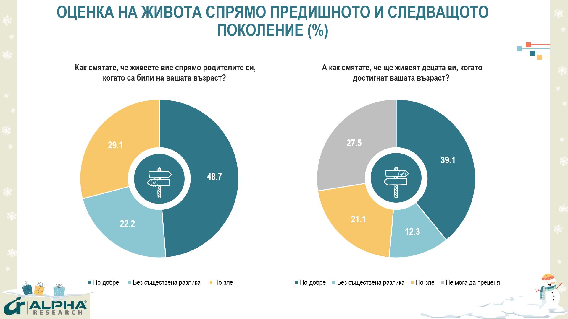 Освен моментна равносметка, проучването отправя и по-широк поглед към минало и бъдеще, през поколенческата призма. Като цяло нагласите са, че всяко следващо поколение живее и ще живее по-добре от предходното – ние сме по-добре от нашите родители, а децата ни ще бъдат по-добре от нас: