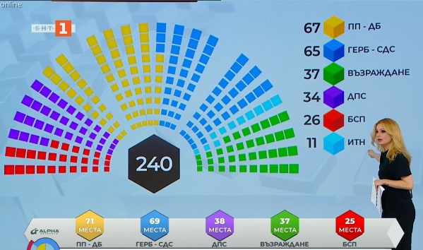 Според първите прогнозни резултати на "Алфа рисърч", представени по БНТ, в парламентарната битка за първото място са "Продължаваме промяната" и ГЕРБ-СДС.