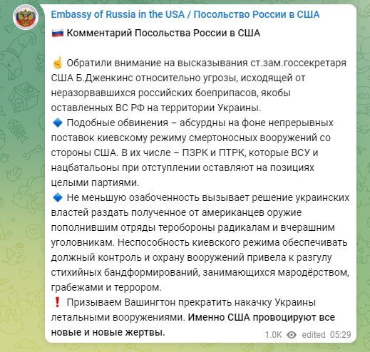 "Следващите необосновани обвинения са част от координираните усилия на западните страни за демонизиране на руските въоръжени сили. Провокацията в град Буча е върхът на лъжата и цинизма. Във Вашингтон, без доказателства, веднага заеха позицията на прокурор и започна да назначава извършителите“, цитират думите му в Telegram канала на посолството.