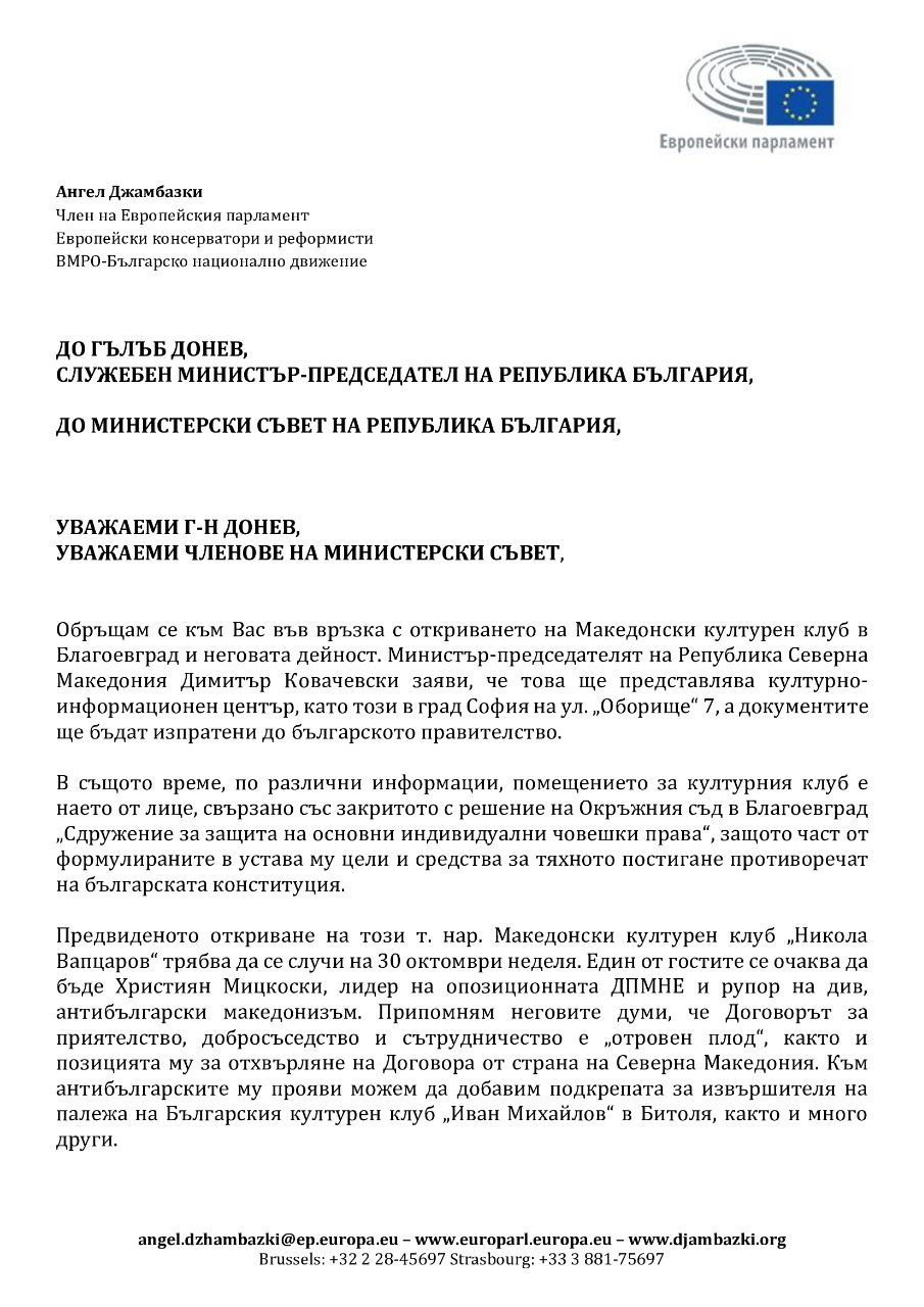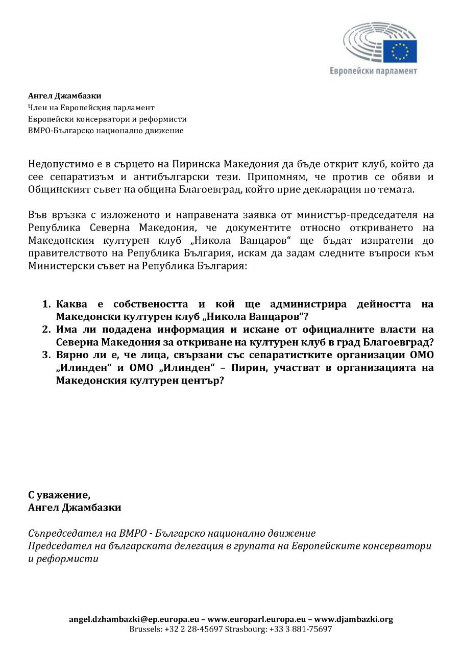 Съпредседателят на ВМРО и български представител в Европейския парламент Ангел Джамбазки постави на вниманието на министър-председателя на Република България и Министерски съвет редица въпроси, свързани с предстоящото откриване на Македонски културен клуб „Никола Вапцаров“ в Благоевград. Той настоява за отговори на въпросите дали в организацията на клуба има лица, свързани със сепаратистките организации ОМО „Илинден“ и ОМО „Илинден“ – Пирин, има ли налице подадена информация и искане от официалните власти на Северна Македония за откриване на културен клуб в Благоевград и как ще бъде администриран той.