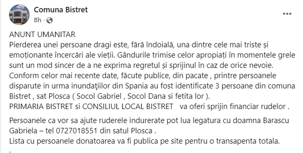 "Хуманитарно съобщение. Загубата на любим човек несъмнено е едно от най-тъжните и емоционални изпитания в живота. Мислите, изпратени до близките в трудни моменти, са искрен начин да изразим съжалението си и подкрепата си в случай на нужда. По последни данни, оповестени публично, за съжаление, трима души от община Бистрет, село Плоска (Габриел Сокол, Дана Сокол и тяхната дъщеря) са идентифицирани сред изчезналите след наводненията в Испания. Кметството и общината ще предложат финансова подкрепа на роднините. Хората, които искат да помогнат на скърбящите си роднини, могат да се свържат с г-жа Баръску Габриела на телефон 0727018551 от с. Плоска", се казва в публикацията на кмета.