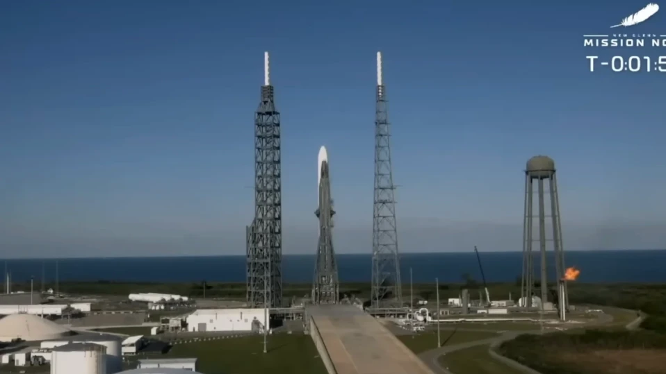Масивната двустепенна ракета, висока колкото 32-етажна сграда, излетя от Кейп Канаверал след няколкодневно отлагане заради гъста облачност и последвала геомагнитна буря. Във видеопредаване на живо се виждаше как „Ню Глен“ се издига в небето, докато седемте ѝ двигателя BE-4 на течно гориво работят на пълна мощност.