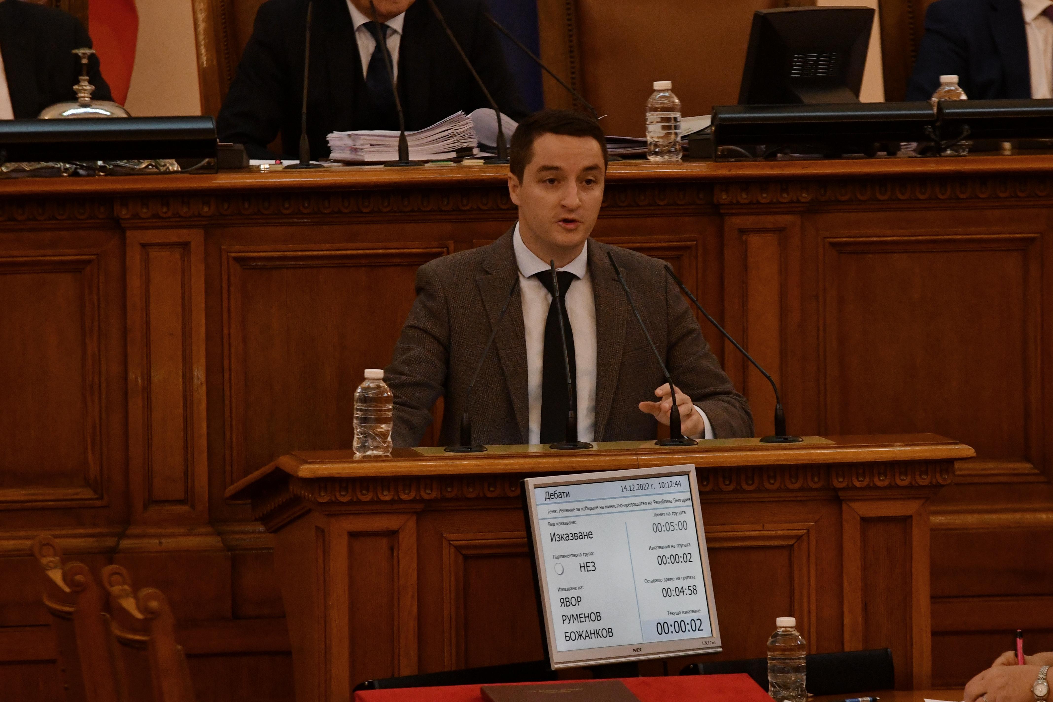 "Самият факт, че те трябва да се скрият зад някой, че трябва да предложат кабинет, от който да се дистанцират, че трябва да кажат, че той сам е селектирал себе си е една романтична история, на която едва ли някой вярва. Зад този факт се крие истинският проблем. Първата политическа сила в България не може да състави редовно правителство, защото няма парламентарна и обществена подкрепа. Смятам, че този кабинет не може да бъде подкрепен, въпреки добрите качества на някои от предложените министри", заяви от парламентарната трибуна Явор Божанков.