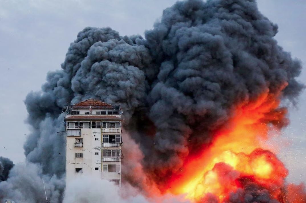 Огън и дим се вият над ударена от израелска ракета кула в град Газа.