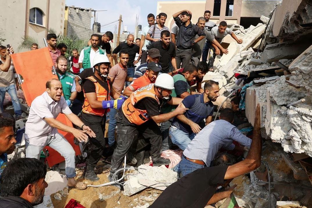 Палестинци издирват оцелели сред отломки на сграда, разрушена в израелските удари днес по Хан Юнис.