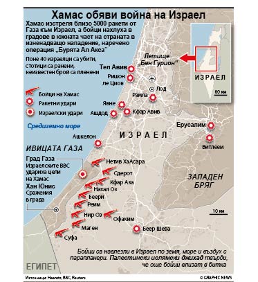 Израелският кабинет по сигурността днес официално обяви състояние на война, часове, след като силите на страната засипаха с ракети ивицата Газа. Това бе отговорът на Тел Авив на баража от ракети (според някои данни 5000), изстреляни от ивицата Газа по цели в Израел. Жертвите от двете страни са над 1000, а десетки, според различни информации дори над 100 израелци, са били пленени от палестинската групировка.