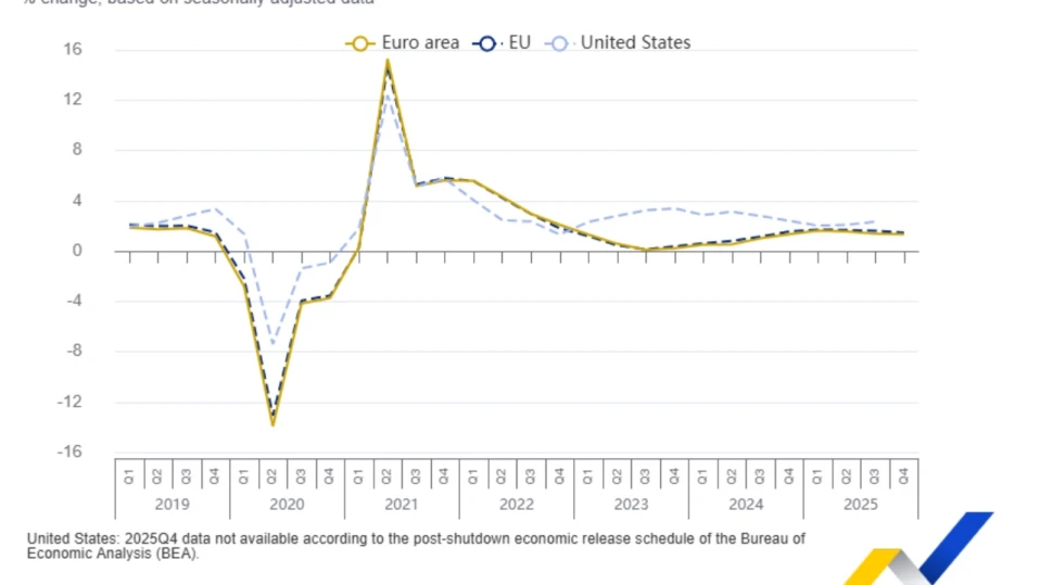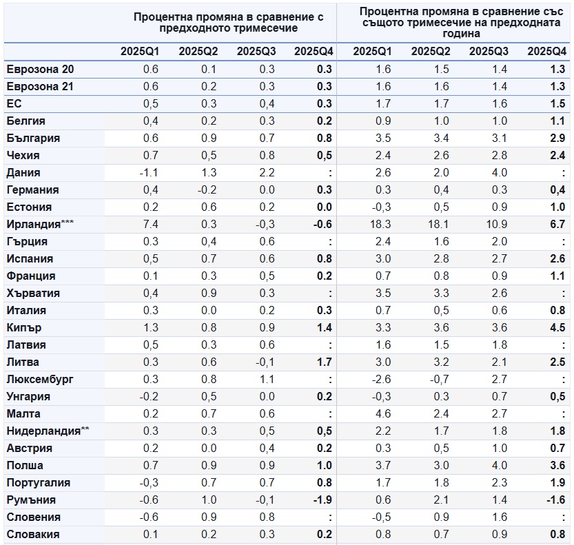 В сравнение със същото тримесечие на предходната година, БВП се е увеличил с 1,3% в еврозоната и с 1,5% в ЕС през четвъртото тримесечие на 2025 г.