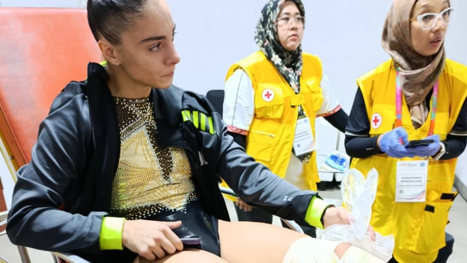 Българката по всяка вероятност отново е със сериозна контузия за коляното. След първия прескок - Юрченко с два винта, тя се приземи и веднага хвана коляното си, след което не успя да направи втория си опит. Тя беше изнесена на ръце от медицински персонал в залата и качена на линейка.