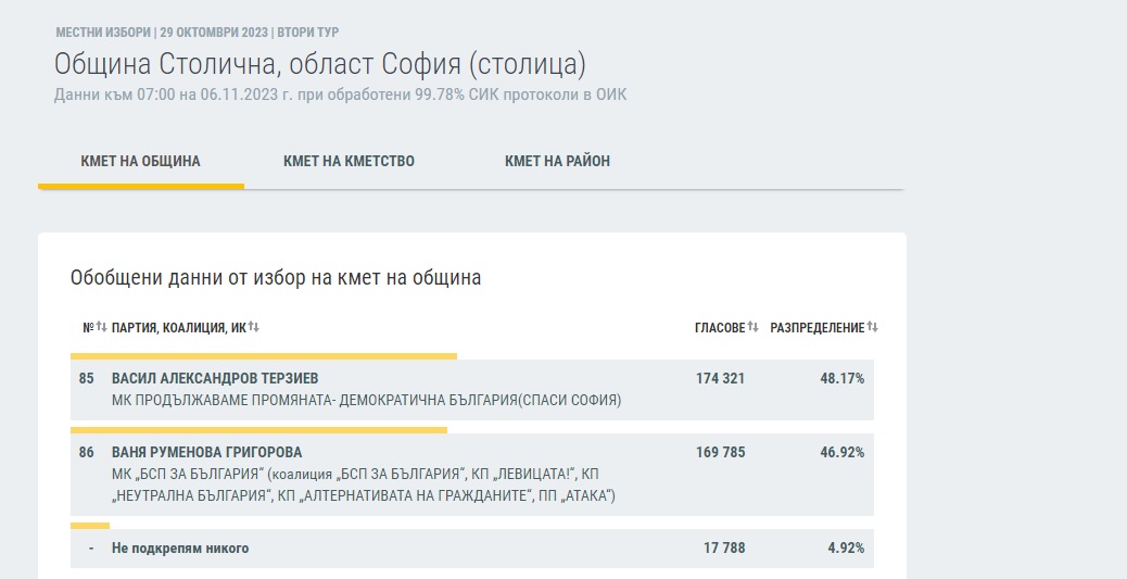 При обработени 99,78% протоколи на Секционните избирателни комисии в София кандидатът на ПП-ДБ-Спаси София Васил Терзиев води в столичната кметска надпревара с 48,17% срещу кандидата на МК "БСП ЗА БЪЛГАРИЯ" Ваня Григорова, която получава 46,92% от гласовете.