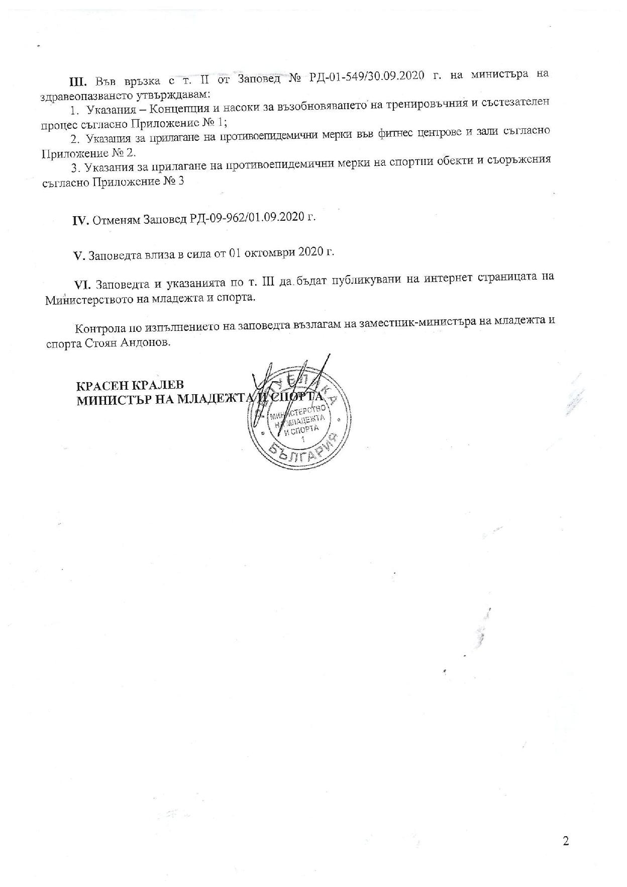 От 1 октомври спортните състезания на закрито ще се провеждат пред публика. Седмица след като министърът на младежта и спорта Красен Кралев проведе среща с представители на шест спортни федерации, на която бяха обсъдени нужните противоепидемични мерки за допускане на публика при провеждане на състезания на закрито, министърът на здравеопазването проф. д-р Костадин Ангелов издаде Заповед, която позволява присъствието на зрители, съобщина от ММС.
