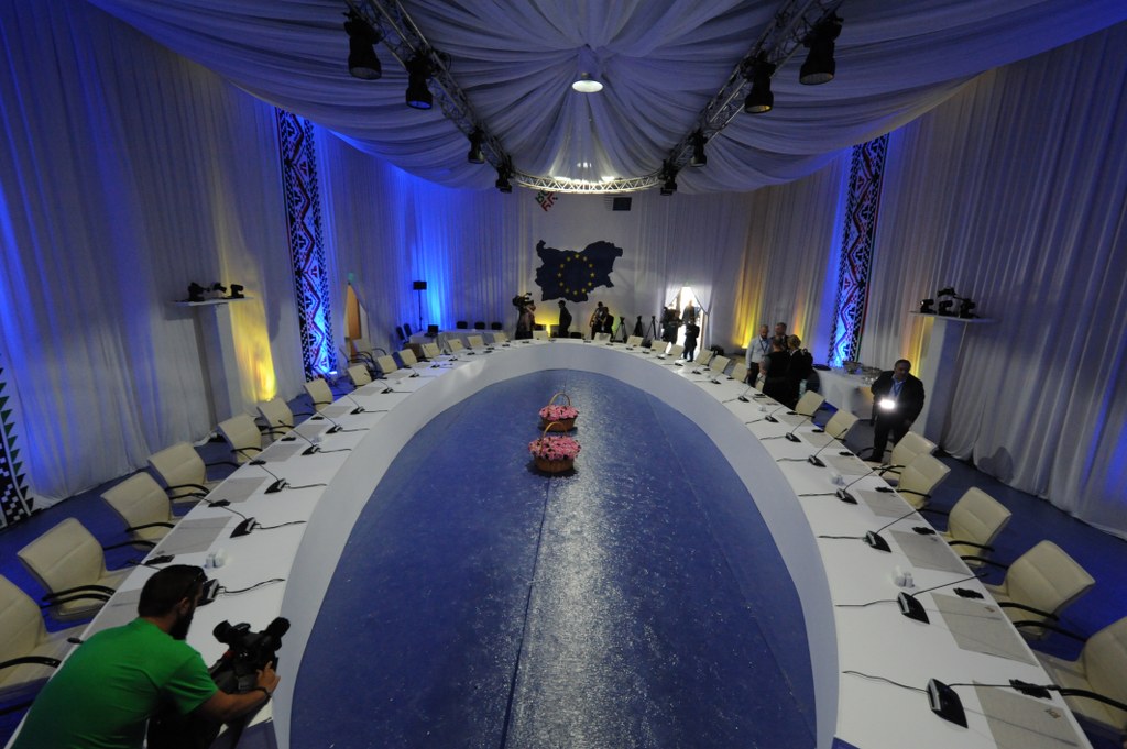 В едната от залите е поставена десетметрова бяла, елипсовидна маса за работната вечеря. В единия край на салона пък има карта на България с венец от 28 звезди на страните членки на ЕС, а на отсрещната стена е изобразен изпъстрен килим с буквите от глаголицата и кирилицата. Върху двете други страни на салона, на бели