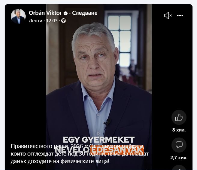 Министър председателят на Унгария Орбан каза във видео, публикувано в официалния му профил в платформата, че на заседанието на правителството са били обсъдени поне дузина въпроси, най-важният от които е решението за освобождаване от данък върху доходите на физическите лица за майки под 30 години, които отглеждат едно дете, което ще влезе в сила от 1 януари 2026 г., уточнява унгарската телеграфна агенция МТИ.