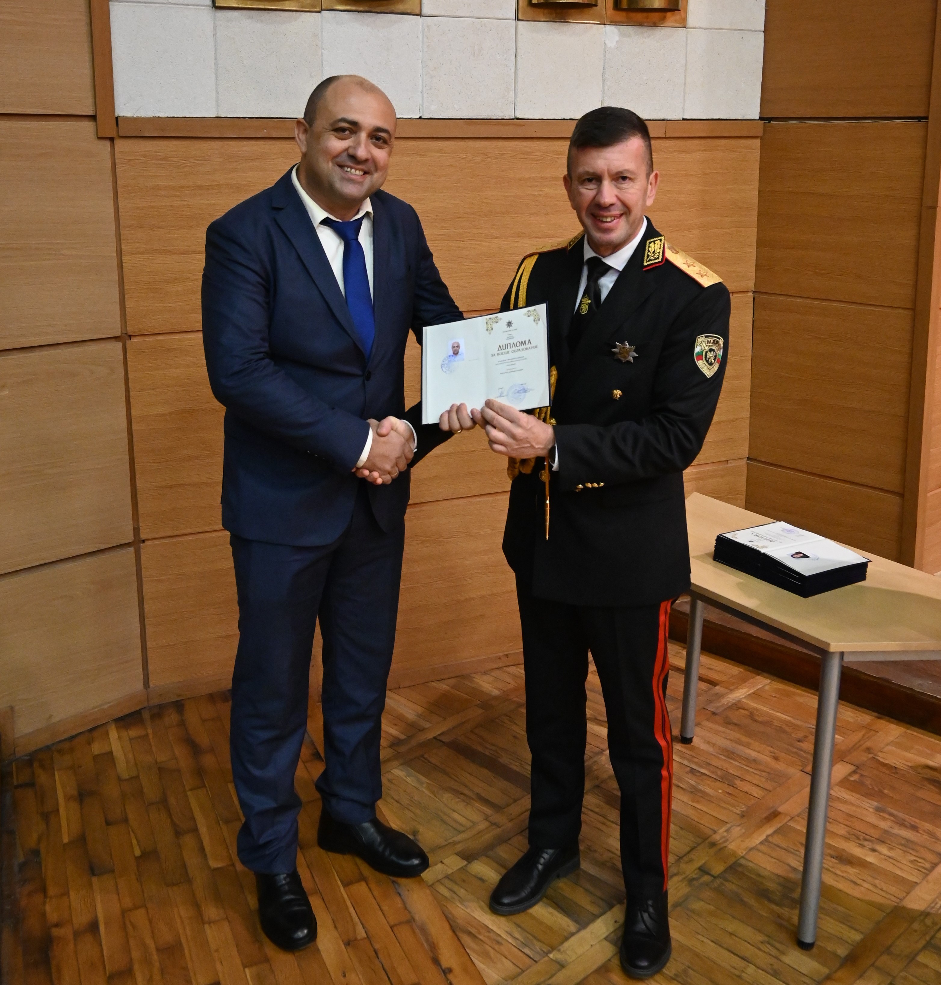 Дипломите за образователно-квалификационна степен „бакалавър“ връчиха ректорът на АМВР старши комисар доц. д-р Иван Видолов и заместник-директорът на Главна дирекция „Пожарна безопасност и защита на населението“ старши комисар Любомир Баров, съобщават от МВР.