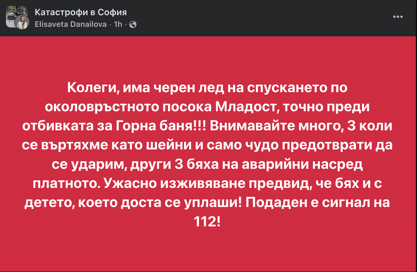Тази сутрин "черен лед" се е образувал на Околовръстния път в София, посока "Младост". За това сигнализира жена в групата "Катастрофи в София". Няколко коли са аварирали преди отбивката за Горна баня.