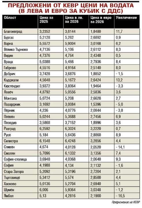 Най-голямо поскъпване на водата в Кърджали, предлага КЕВР. През 2026 г. цената на водата в града ще бъде 5,17 лв. за кубик, или 2,64 евро, което е увеличение с 13,2 на сто. На второ място по повишение на цените е Благоевград, където водата ще струва 3,61 лв. за кубик, или 1,85 евро. Това е увеличение с 11,7 на сто.