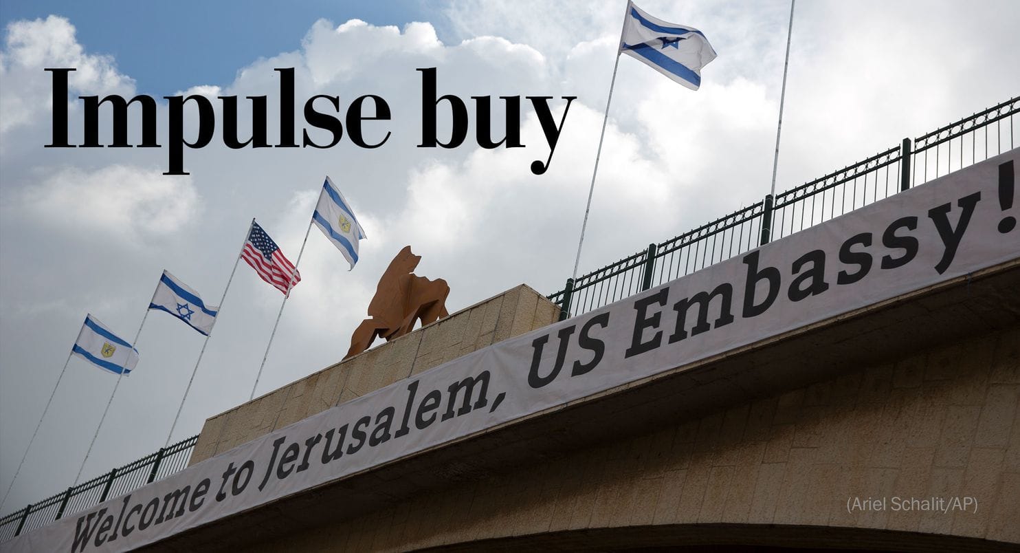 Наречете го "Купете сега, а платете по-късно", една фраза, която може да се използва както буквално, така и символично. В случая с посолството в Йерусалим Тръмп настоява да се изгради ново евтино посолство и според неговите бизнес разбирания, той в четвъртък повтори това, като свали цената на преместването от 1 млрд. долара на около 400 000 долара.