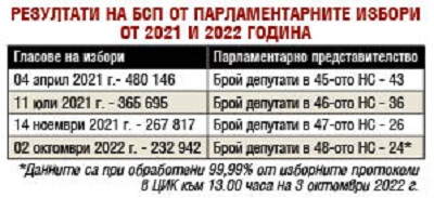 На тези избори БСП получава 232 942 гласа или едва 9,30 процента подкрепа, което е най-слабият резултат на партията от парламентарни избори. За сравнение, на 4 април 2021 г. партията е имала подкрепа от 480 146 гласа (виж таблицата, б. р.)
