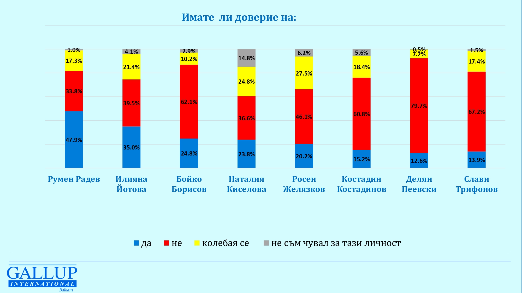 Сред заемащите висши конституционни длъжности: президентът Румен Радев регистрира леко понижение в одобрението през февруари – 47,9%; одобрението за министър-председателя Росен Желязков нараства спрямо януари и понастоящем е 20,2%; председателят на НС Наталия Киселова е одобрявана от 23,8%. Сред партийните лидери с най-високо одобрение се ползва Бойко Борисов – 24,8%.