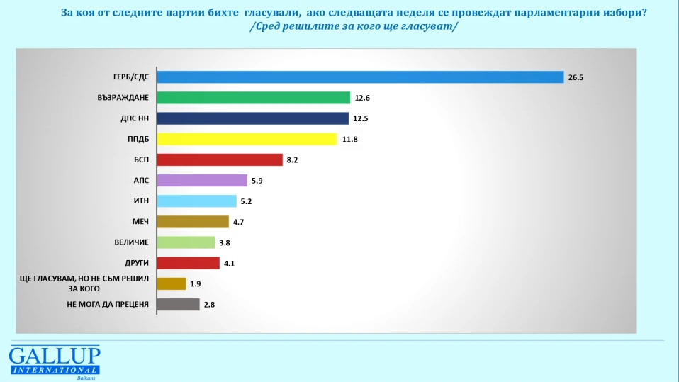 ПП-ДБ е с 11,8%, БСП-Обединена левица показва леко повишение спрямо миналия месец от 7,4% на 8,2%. АПС получава – 5,9%, ИТН – 5,2%, МЕЧ – 4,7, а „Величие“ е под 4-процентната бариера – 3,8%. Останалите дялове се разпределят между формации с декларирана на този етап подкрепа под един процент.