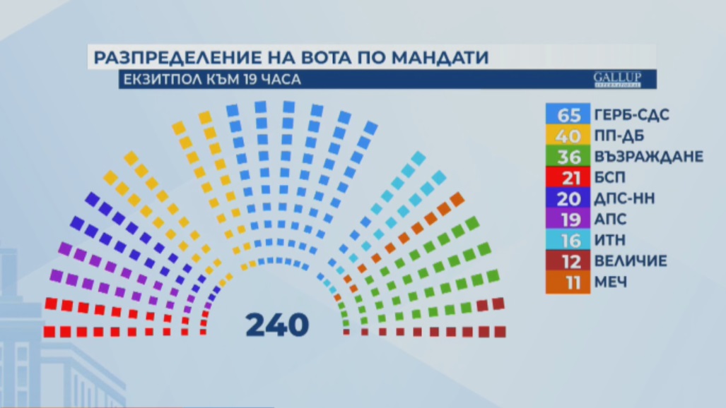 Според екзитпола на "Галъп интернешънъл" към 20:00 часа общо девет формации влизат в 51-вия парламент и мандатите им биха се разпределили по следния начин: