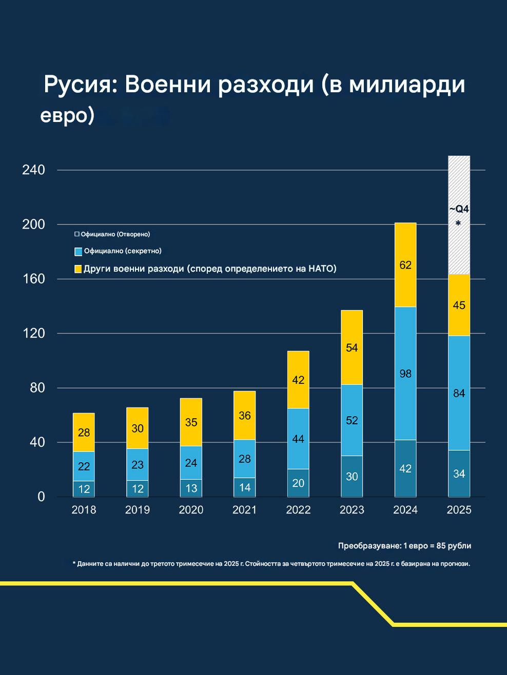 Според по-широката класификация на НАТО, която освен преките разходи за армията, включва например и строителните проекти на Министерството на отбраната, ИТ-проекти за армията, социални разходи за членовете на въоръжените сили и др., миналата година руската хазна е похарчила 250 милиарда евро за вместо декларираните 150 милиарда евро.