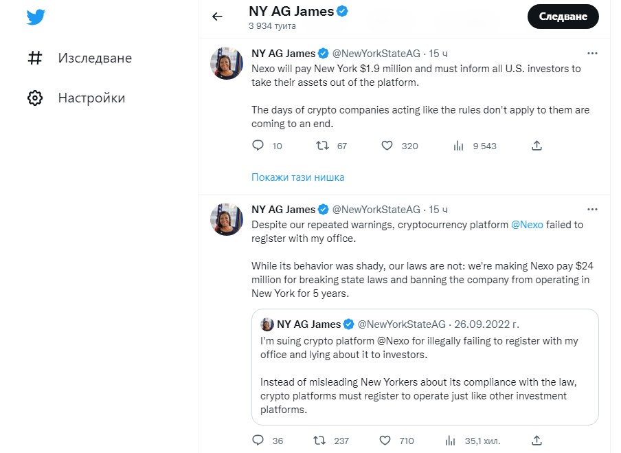“Въпреки неколкократните ни предупреждения, платформата за криптовалутата NEXO се провали в това да се регистрира. Въпреки, че поведението им беше съмнително, нашите закони са ясни: ще накараме NEXO да плати 24 млн. долара за нарушаване на щатските закони и забранявам на компанията да оперира на територията на щата за срок от 5 години”. Това написа вчера в профила си в Туитър главният прокурор на Ню Йорк Летиша Джеймс. Тя обяснява още, че NEXO ще плати и 1,9 млн. долара на Ню Йорк, както и, че са задължени да информират всичките си американски инвеститори да изтеглят активите си от платформата. “Дните, в които крипто компании се държаха все едно правилата не се отнасят за тях, са към своя край”, заканва се още Джеймс.