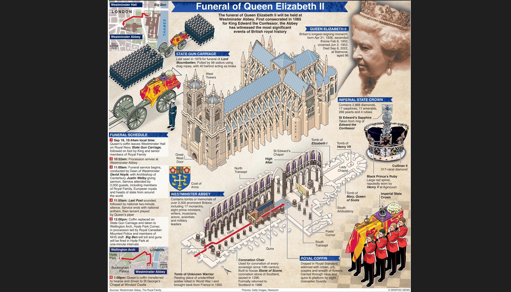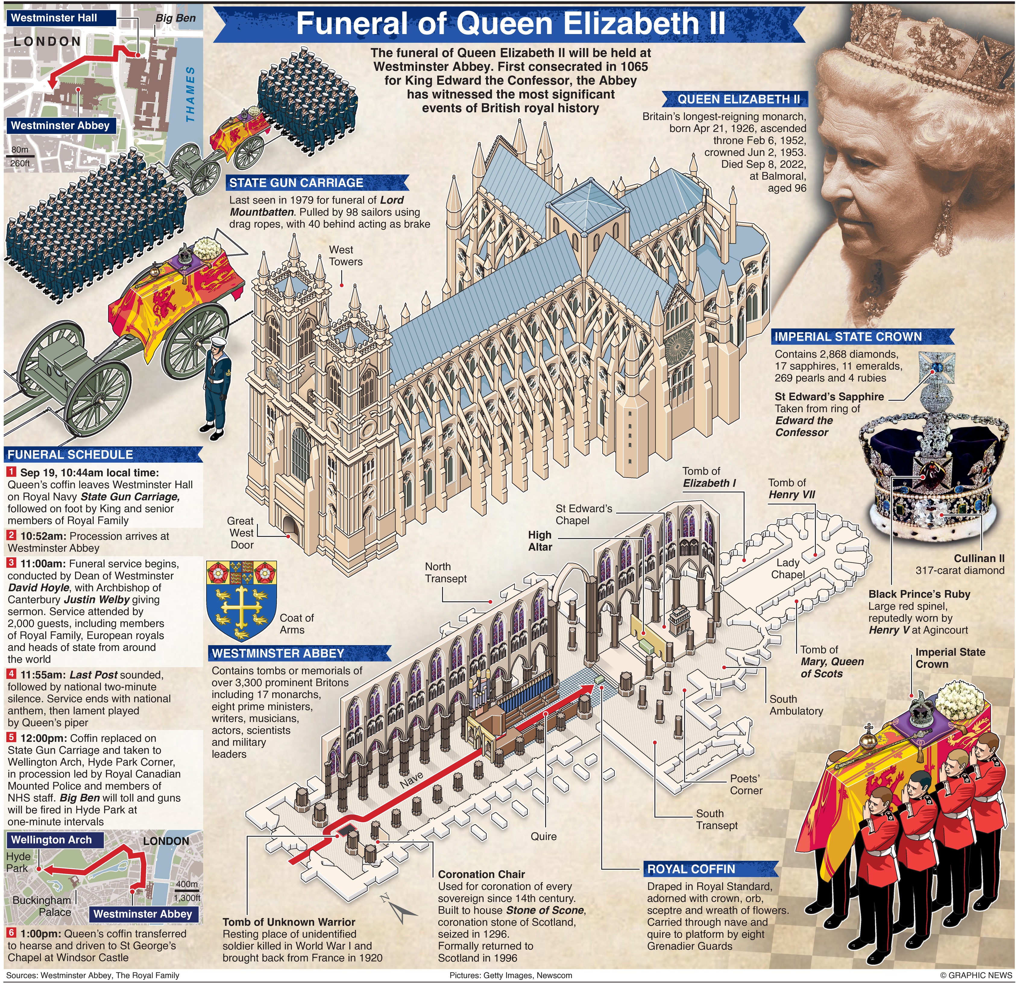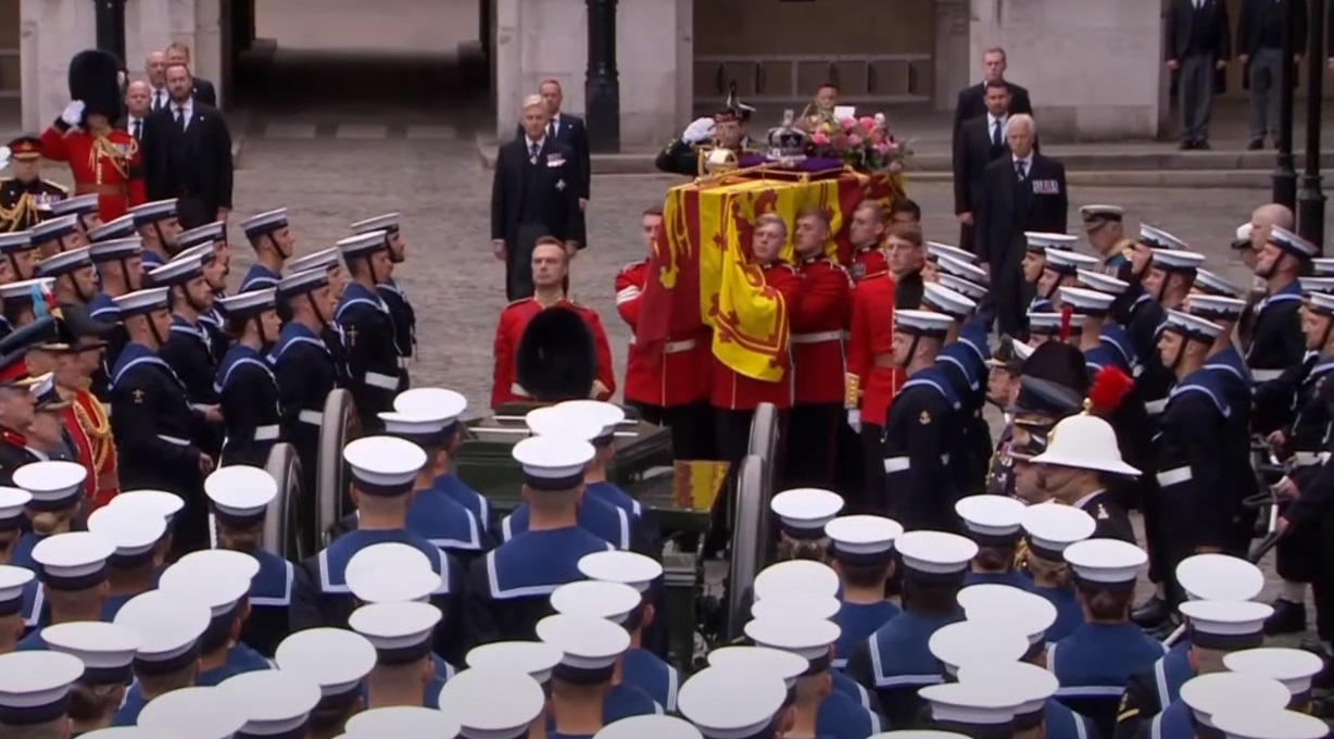 Преди това от Уестминстър хол до абатството потегли оръжеен лафет с ковчега на кралицата. Той е теглен от 142 моряци. Зад него вървят крал Чарлз Трети и принцовете Уилям и Хари. Този лафет е използван за първи път при погребението на кралица Виктория. А за последен път държавно погребение е имало през 1965 г, по време на погребението на Уинстън Чърчил.