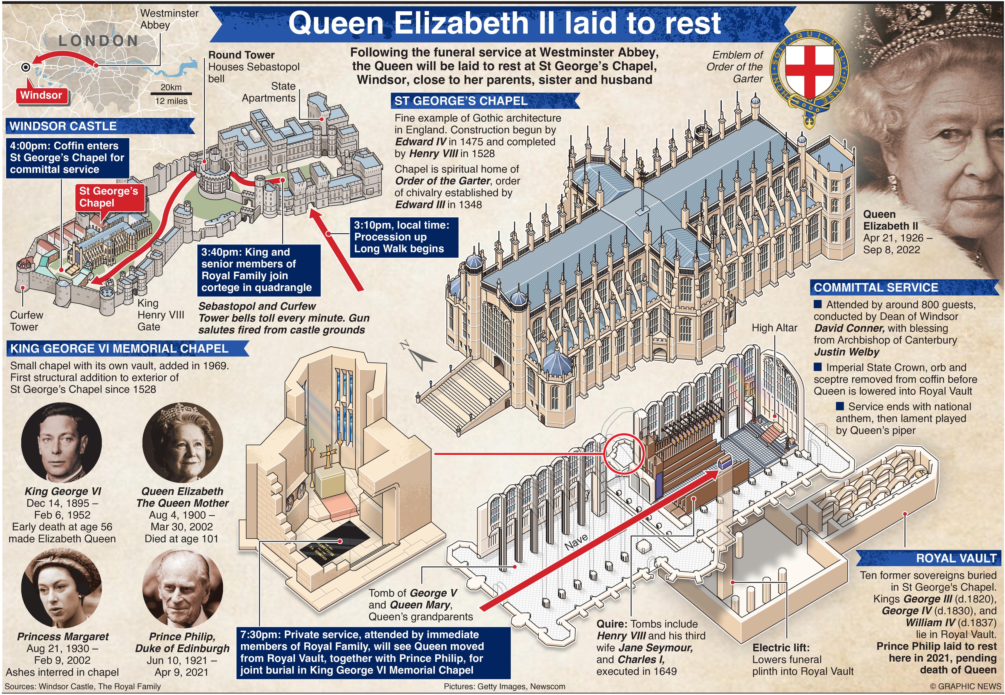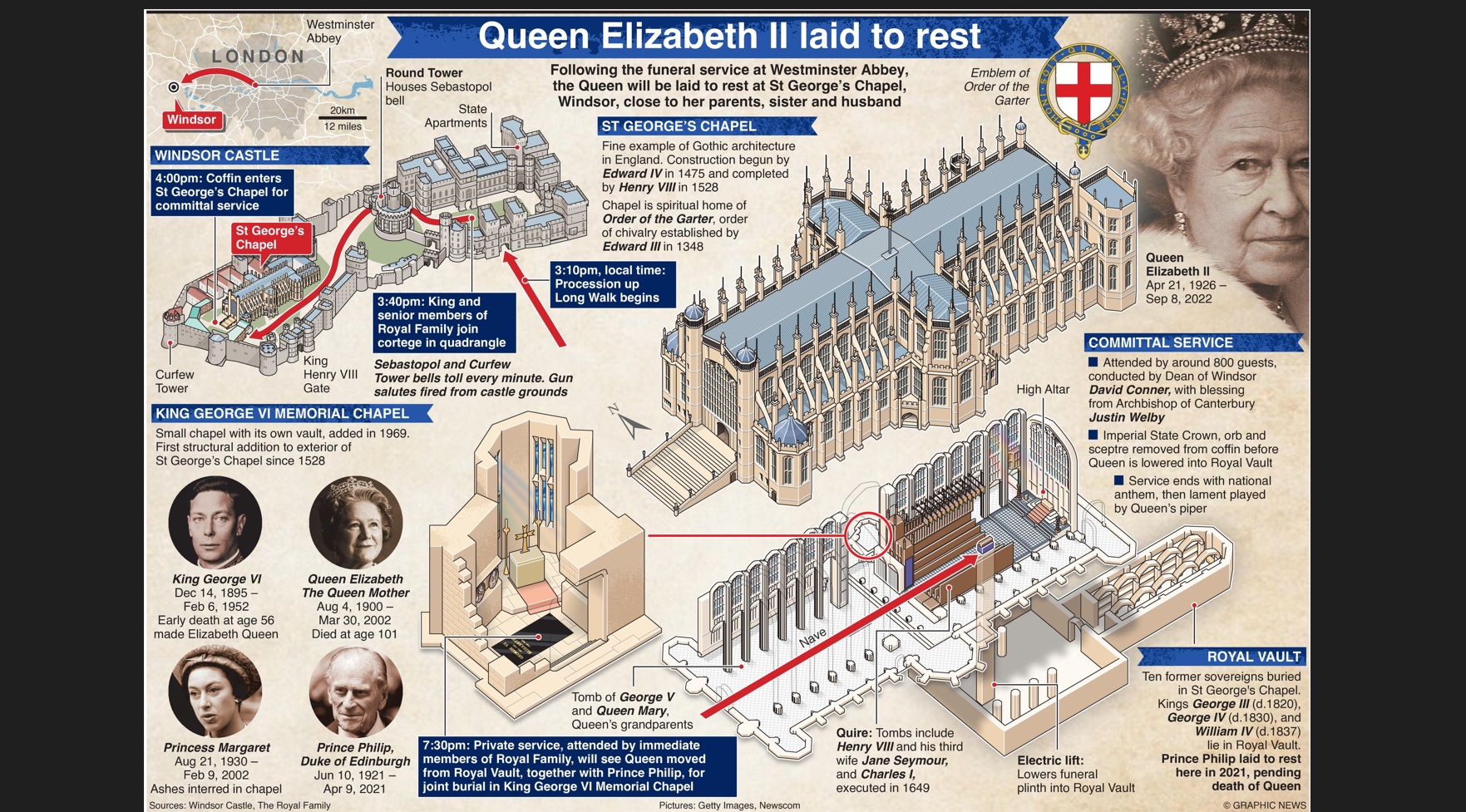 Вечерта ще бъде отслужена служба в параклиса "Сейнт Джордж" с ритуали, които ще ознаменуват края на управлението на кралицата. Имперската корона ще бъде свалена от ковчега заедно със златния скиптър.