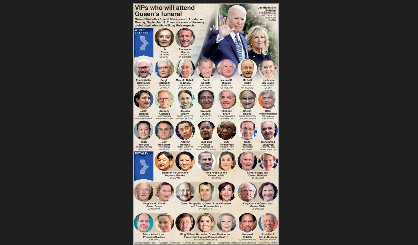Над 500 са високопоставените гости - държавни и правителствени ръководители, кралски особи. Своите места вече заеха американският президент Джо Байдън, френският държавен глава Еманюел Макрон, както и британският премиер Лиз Тръс. Влязоха и бивши британски премиери - Дейвид Камерън, Тереза Май и Борис Джонсън.