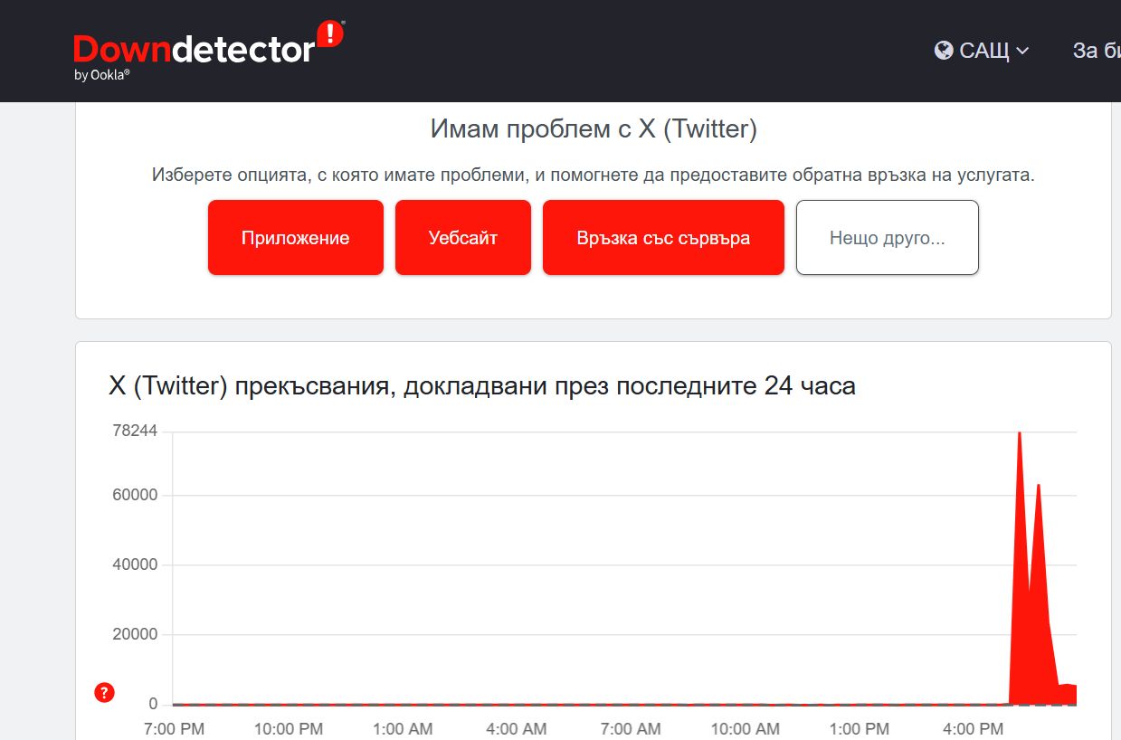 Социалната мрежа X претърпя сериозен срив. Към 19:00 ч. българско време време са получени над 78000 оплаквания от потребители, според данни на Downdetector. Проверка на "Труд онлайн" установи, че от първоначално проблем с бутона "embed", към момента има такъв с почти всички функции. Коментар от собственика Илон Мъск към момента няма.