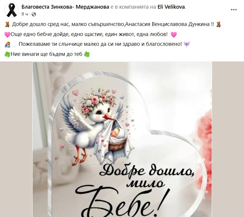 Годеницата на загиналия през септември пилот капитан Венцислав Дункин д-р Елеонора Великова роди момиченце. Бебето носи името Анастасия и е дошло на бял свят във вторник, съобщи майката в профила си в социалната мрежа "Facebook". Най-радостната вест споделиха и техни роднини. Бебето Анастасия носи за презиме и фамилия имената на покойния си баща - Венцислав Дункин.