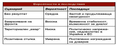 Най-спорният вариант - Русия получава официално или неофициално контрол над ключови територии в Източна Украйна и Крим срещу спиране на бойните действия. Конституцията на Украйна забранява подобни отстъпки, а в Киев и Брюксел този сценарий се приема като червена линия.