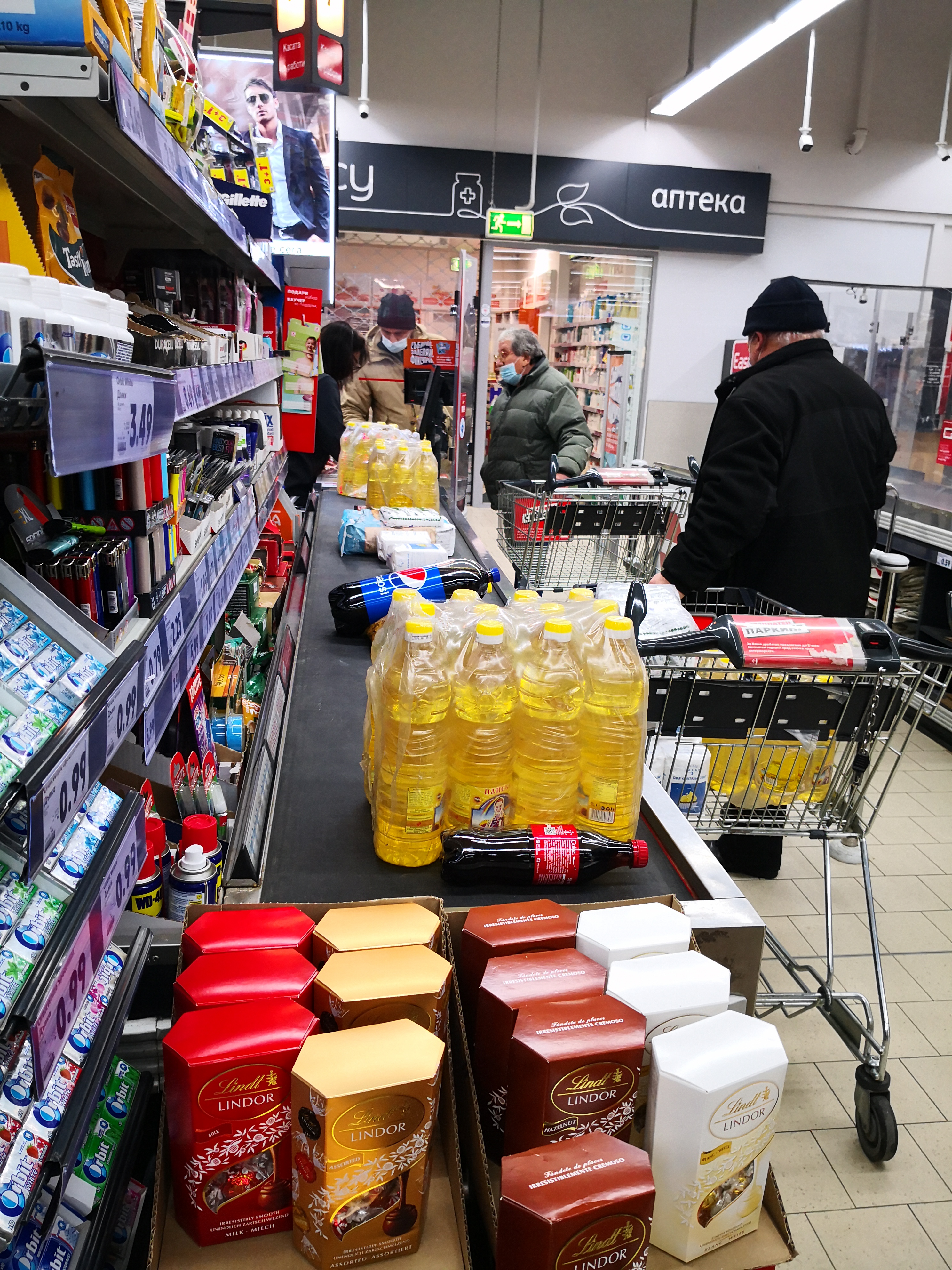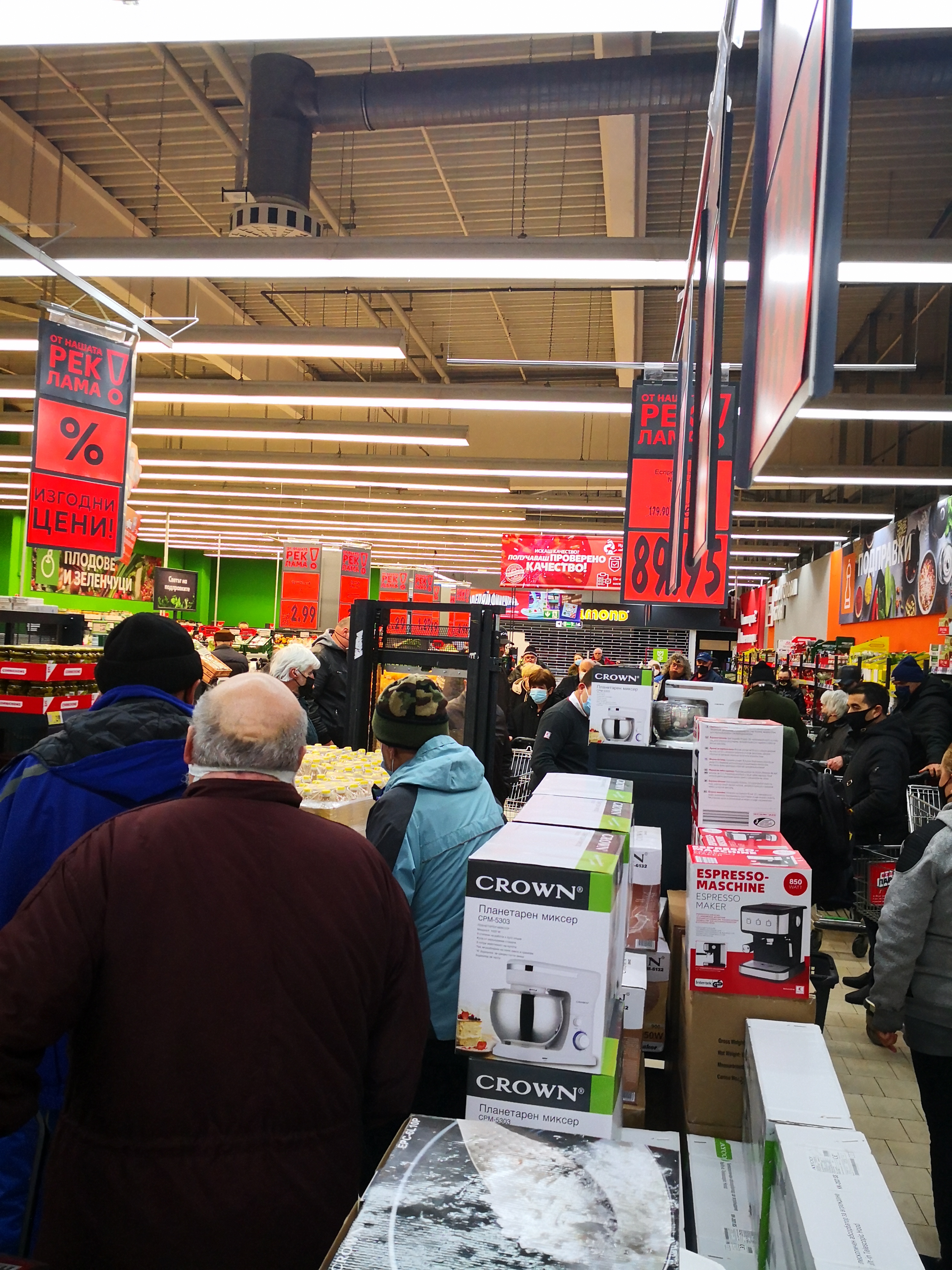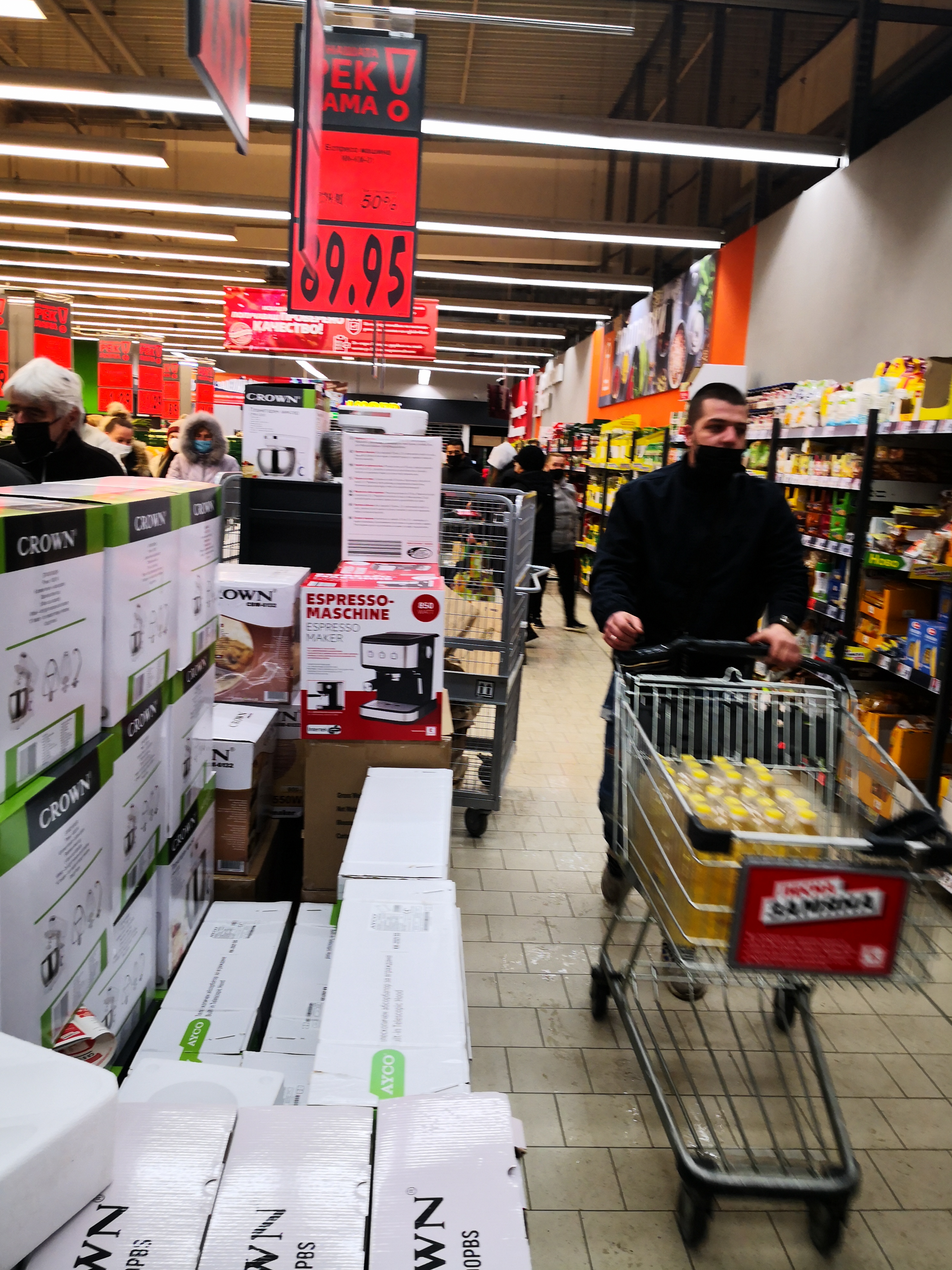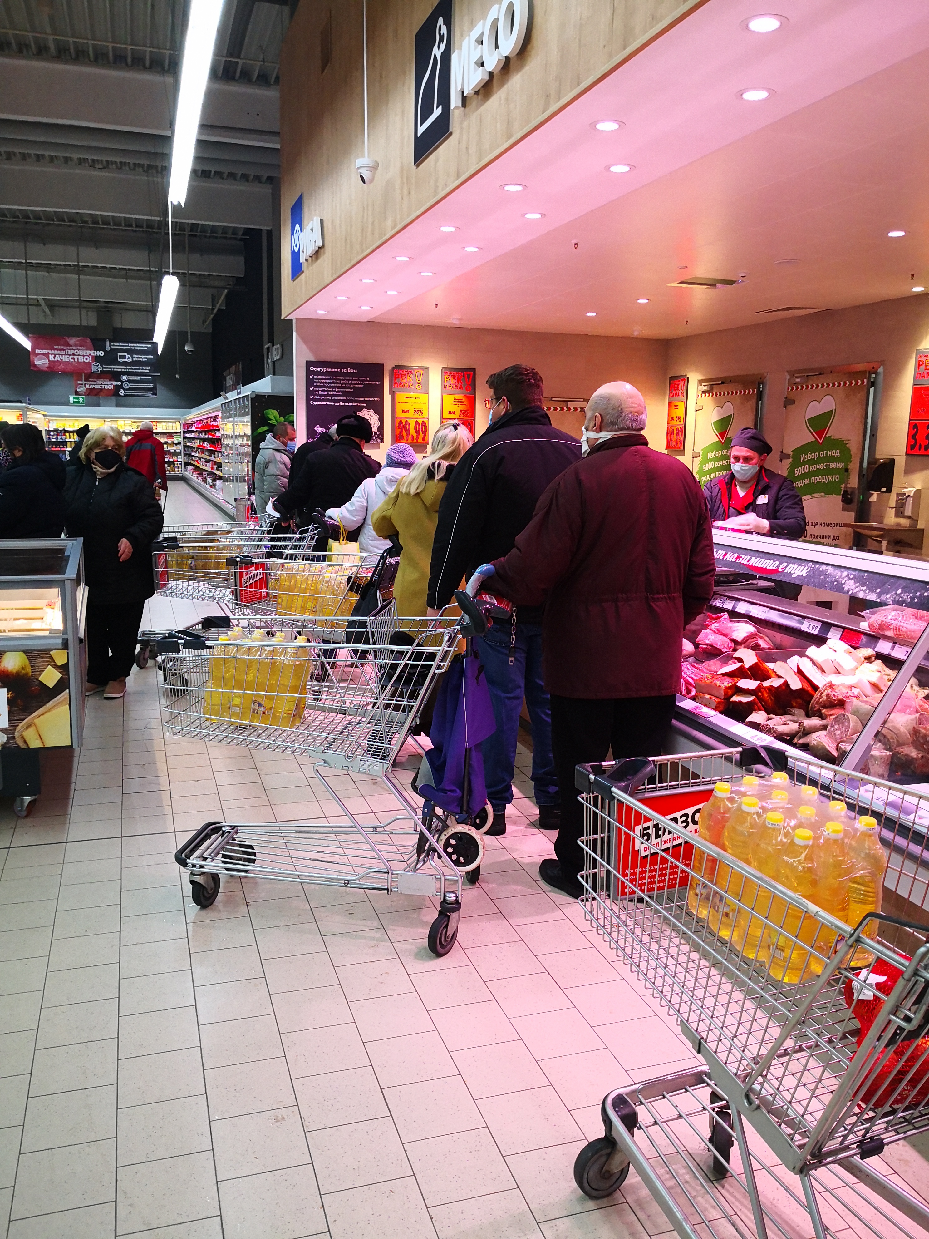 След отварянето на магазина в 7 часа в мразовитото съботно утро, в магазина се тълпяха множество хора, които на пазарските си колички товареха главно по един стек олио. Колкото беше въведеното ограничение за един клиент.
