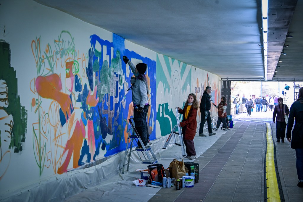 В рамките на три дни – от 24 до 26 октомври – едни от най-добрите графити артисти в България преобразиха пространството около подлеза, превръщайки го в цветна и вдъхновяваща среда, а темата, която развиха, бе връзката между природата и технологиите.