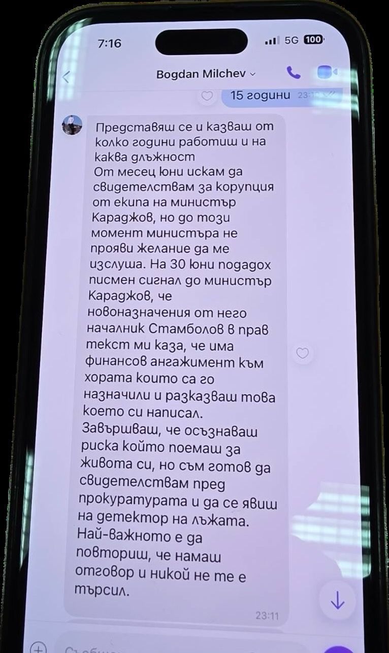 - Не, никъде няма да ходя, спрях да вдигам телефона на тези хора, аз не контактувам с тях и добре, че направих скрийншотове на техните съобщения, защото вече са ги изтрили и щяха да казват, че си измислям. Но те говореха със злоба за г-н Караджов и г-н Тодоров - това бил екипът, който задължително трябвало да се отстрани от министерството на транспорта. Все едно имаха нещо лично, не знам. Искаха мене да ме използват като служител, понеже съм написал такъв сигнал... Какви са им причините и какви са им подбудите, не знам.
