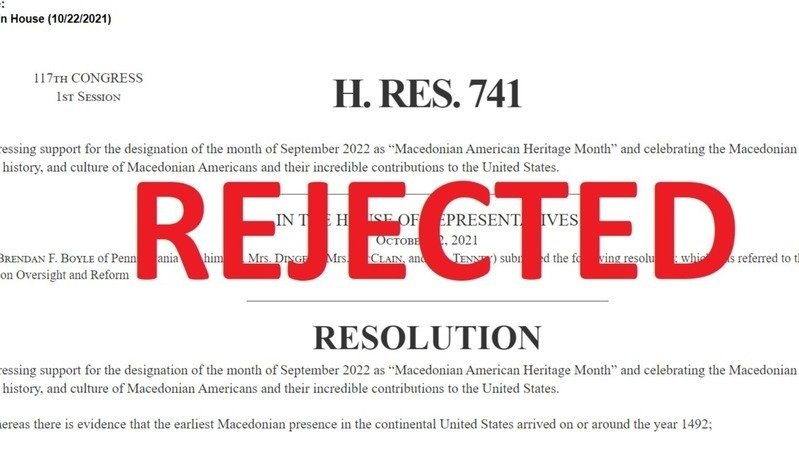 Две резолюции на Конгреса и Сената на САЩ, инициирани от македонистки организации с цел обявяването на месец септември 2022 г. за "Месец на македоно-американското наследство", са били отхвърлени. Това съобщиха на своята фейсбук страница от най-старата организация на македонските българи там "Македонска патриотична организация "Пирин".