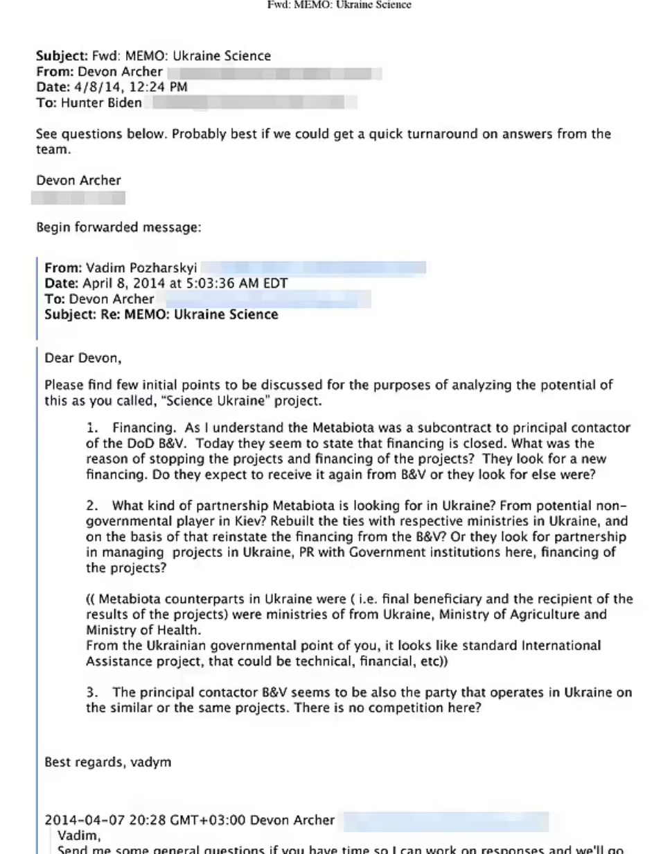 Четири дни след имейла на Гутиери от април 2014 г., изпълнителният директор на Burisma Вадим Пожарски пише до Хънтър, разкривайки, че синът на тогавашния вицепрезидент е предложил „научен проект“, включващ Burisma и Metabiota в Украйна. „Моля, намерете няколко начални точки, които да бъдат обсъдени за целите на анализа на потенциала на този, както нарекохте, проект „Наука Украйна“, пише Пожарски.