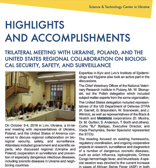Metabiota е работила в Украйна за Black & Veatch, американски изпълнител в областта на отбраната с дълбоки връзки с военните разузнавателни агенции, които са изградили сигурни лаборатории в Украйна, които анализират смъртоносни болести и биологични оръжия.