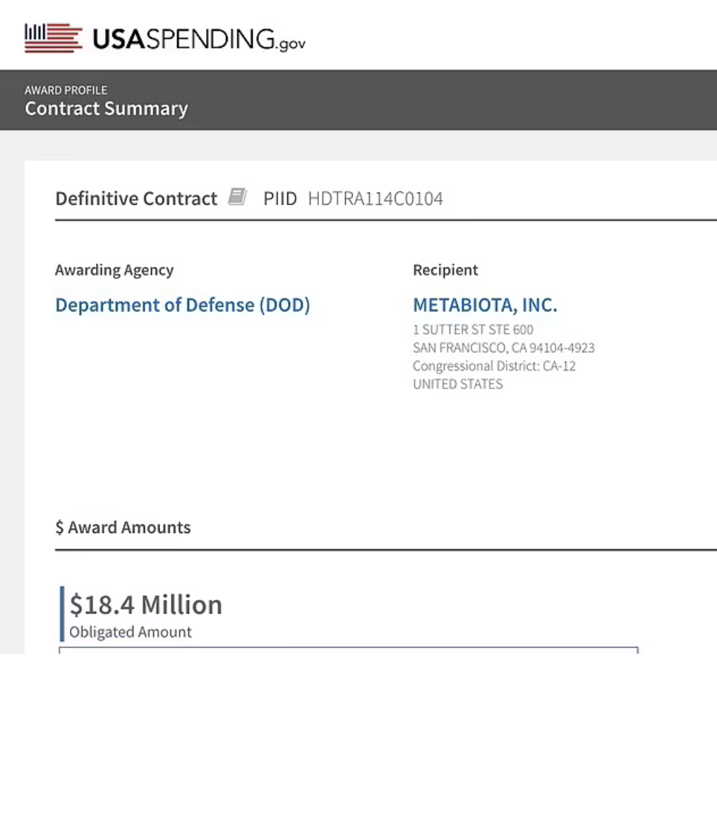 Данните за държавните разходи показват, че Министерството на отбраната е възложило договор за 18,4 милиона долара на Metabiota между февруари 2014 г. и ноември 2016 г., като 307 091 долара са предвидени за „изследователски проекти в Украйна“.