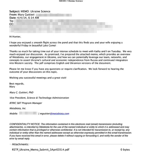 През април 2014 г. вицепрезидентът на Metabiota Мери Гутиери пише бележка до Хънтър, в която очертава как могат да „утвърдят културната и икономическа независимост на Украйна от Русия“. „Много благодаря, че отделихте време от напрегнатия си график, за да се срещнете с Кати (Димео, изпълнителен директор на Metabiota) и мен във вторник. Много ни хареса нашата дискусия“, пише Гутиери. „Както обещах, подготвих приложената бележка, която предоставя преглед на Metabiota, нашия ангажимент в Украйна и как можем потенциално да използваме нашия екип, мрежи и концепции, за да отстояваме културната и икономическа независимост на Украйна от Русия и продължаваща интеграция в Западното общество."